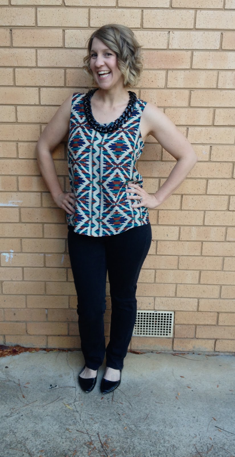 Gah! The pains of trying to photograph this top! Apparently my rad Aztec bars are too awesome to allow a point of focus on the ole iPhone. This fabric has been sitting in my stash since our New York trip last year. I had just entered Mood Fabrics and had pretty much started twitching like a squirrel on sherbet in the silk section when this bad boy was being swatched. It’s totally not my normal style but for some reason I had to have it and very politely snitched the bolt away after it was finished with. So thank you ridiculously well dressed design student guys- you’re helping this Canberra gal get sassy 12 months on! Of note- I ended up using the wrong side of the fabric as I preferred the colours and the matte finish. Also it feels absolutely amazing on. Silk win!
